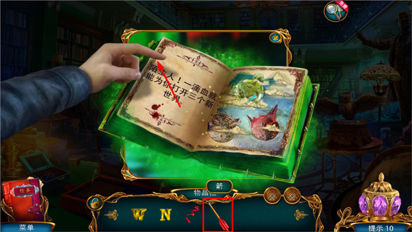 15、把打火机燃油注入打火机内,点击桌面,用打火机烧锁,从而得到丝带和箭,点击书本,拿箭戳伤手指。