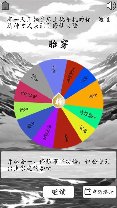 《我靠转盘修炼成仙》这款游戏属于文字修仙类手游,它以模拟随机文本的形式,让玩家体验修仙界的种种经历,进而谱写独属于玩家自己的修仙故事。彼时,正惬意躺在床上玩手机的我,冷不丁瞧见手机屏幕上赫然出现“是否穿越”的选项。出于内心的好奇,我点下了“是”,就这样获得了穿越到修仙大陆的契机。穿越后,我带着上辈子的魂力成功出生,先天灵魂强度比旁人高出一大截。来到修真界,我隐藏起来的血脉显示为普通人类。在这片修仙大陆上,人类依旧占据着主要势力。