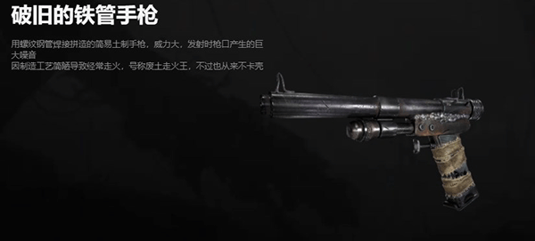 首先要介绍的是我们的基础武器——破旧的铁管手枪。它作为开荒时的首把武器,外观极具复古感,构造也十分简易。可千万别小瞧它,其威力不容轻视。然而,这把枪械存在一个较大的缺陷,由于太过简陋,时常会出现走火的情况,大家使用时务必多加小心。