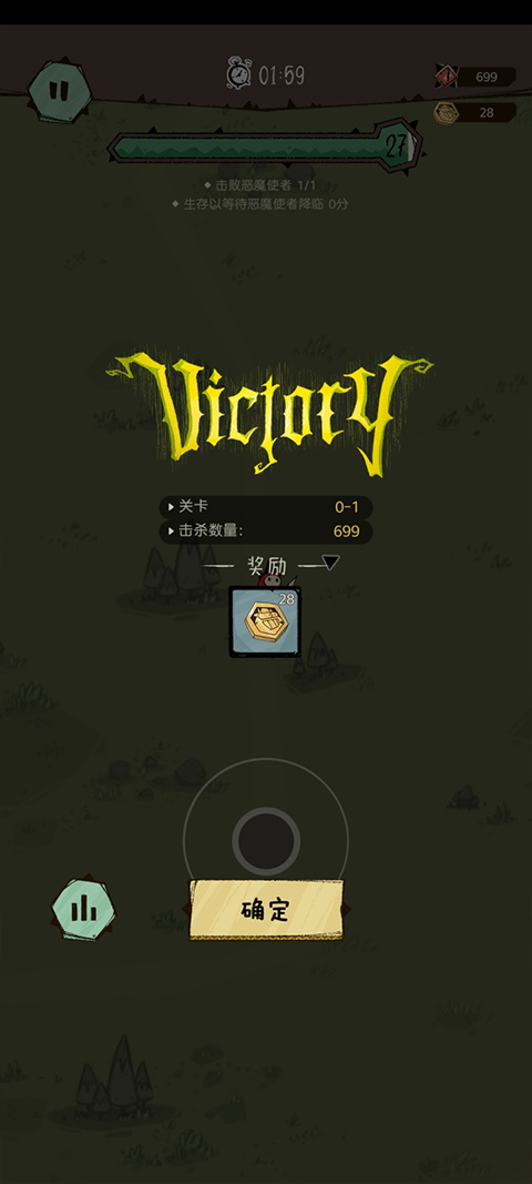 5、ok本关费时1分59秒,击杀699小怪,点击确定可进入下个关卡啦。