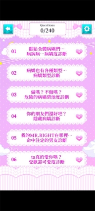 《病娇诊断》中文版是一款趣味性十足的模拟测试手游。在游戏里,玩家们能够检测自己是否属于Menhera,即病娇类型。整个检测过程轻松简单,只需回答游戏中的问题,并点击对应的插图给出答案,最后便会得出详细的诊断结果,让你能轻松直观地知晓自己的病娇程度。