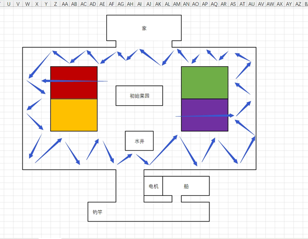 第二个原因在于尽可能将鹿哥限制在初始菜园周边。如此一来,到了夜晚,你便无需额外留意鹿哥是否出现。围绕农场转圈,仅在外围行动,根本不必担忧会碰到鹿哥。中间的菜园索性舍弃,就让鹿哥留在那里守着。要是鹿哥守在右下角,那就前往左上角进行种植。