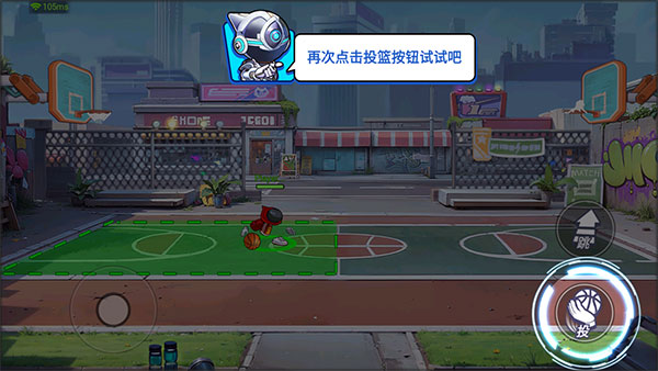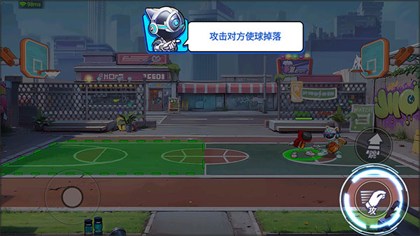 1、成功下载并安装《灌篮军团》后,进入新手教学环节。一开始,利用左侧的轮盘来操控角色移动,当角色靠近篮球时,便能自动捡起。