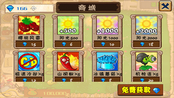 4、游戏设有阳光道具,当玩家在前期阳光不足时,使用该道具能够马上获取500个阳光。