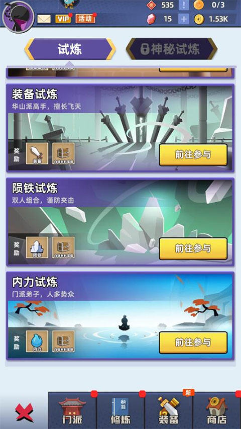 5、当解锁试炼后,我们能够经由装备试炼、内力试炼等副本,获取各类道具与装备。
