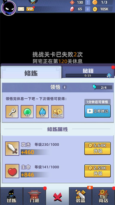 3、接下来我们进入到门派界面,我们可以通过修习门派秘籍和心法来提升战力