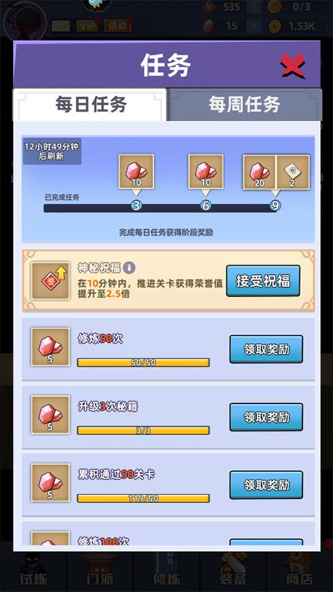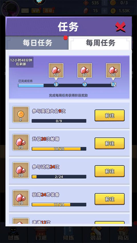 3、点击“每周任务”,参与秘籍升级、试炼之类的任务,当完成次数达到指定要求后,同样能够领取宝石。