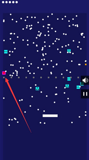 1在玩这个游戏时,玩家要操控一条横条,让小白球反弹以击碎一块块砖块。那怎样才能打完所有方块呢?诀窍是将小白球打到两排方块中间,就像下图这样,这样球就不会掉落,会一直在上方反弹。