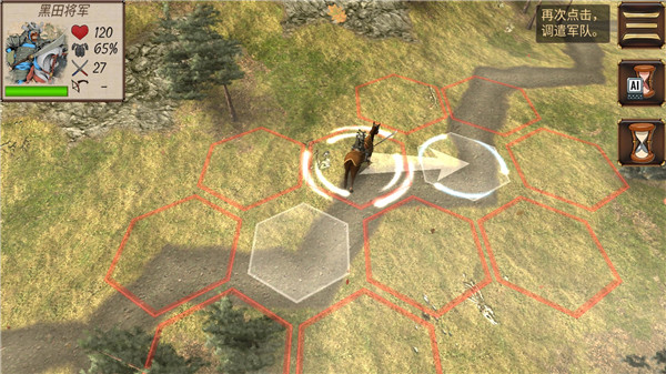 3. 经过几个回合后,对两翼的道路情况进行评估,让赤本挑选最优的一翼前去驻扎。由于敌人很快会实施包夹战术,为避免主公陷入包围圈,必须提前转移,同时放弃一翼。而中路的窄道则可继续占据。(小弟选择了上方的通路)