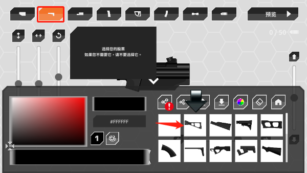 4、挑选一个枪托,若你想射击的枪无需这个枪托,便可不选。随后依次点击枪的各个部位,打造一款专属于自己的枪型。