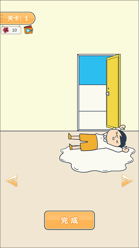 2、前往右边的场景,将橘子拖拽至妹妹身上,接着点击钱。随后来到中间场景,把陷阱拖放到地上,最后点击门。