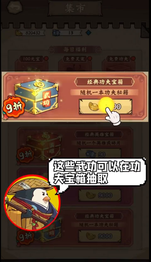 6、元宝优先用于收集所有武功,这些武功既能够从功夫宝箱中抽取,也可在武林珍藏里获取。待64本秘籍全部集齐后,再用元宝抽取灵宠宝箱。