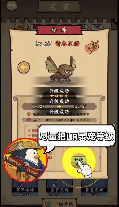 7、最后进行灵宠升级,尽可能将UR灵宠的等级提升至10级,以此解锁全部天赋。完成上述养成步骤后,就能够前往限时宝箱抽取UR武功或灵宠,从而加速提升战斗力。