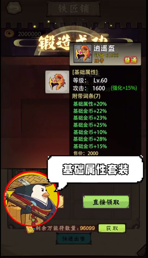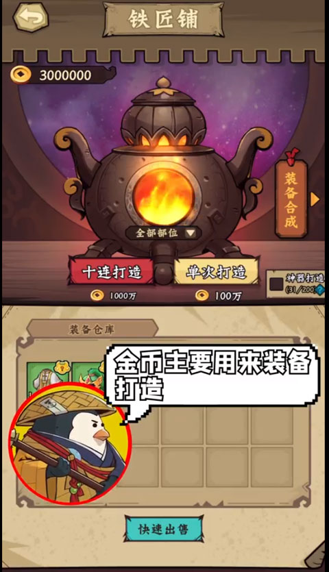 4、金币主要用于装备打造与装备合成。前期建议优先用金币打造三套装备,分别为基础属性套装、挂机金币加成套装以及闯关金币加成套装。待凑齐这几套装备后,即便金币花光也无需担忧。而当金币再次积攒起来,便能够用于升级武功。