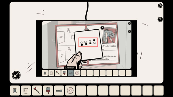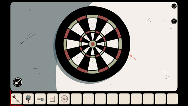 6、点击位于显微镜下方的柜子,从中获取手电筒以及带有化学方程式的镜片,接着在飞镖盘处拿到飞镖。