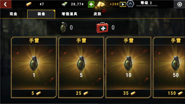 7、在游戏里,除了能购买手榴弹、血包等各类装备,还可以解锁并使用不同的皮肤。以上便是大战僵尸军团官方版的游戏攻略。
