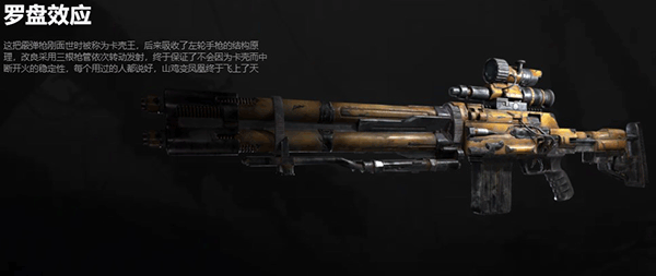罗盘效应,大家也亲昵地称它为卡壳王。这款武器借鉴了左轮手枪的结构,使得发射时3个枪管能够依次转动发射,是颇受众多玩家喜爱的武器之一。