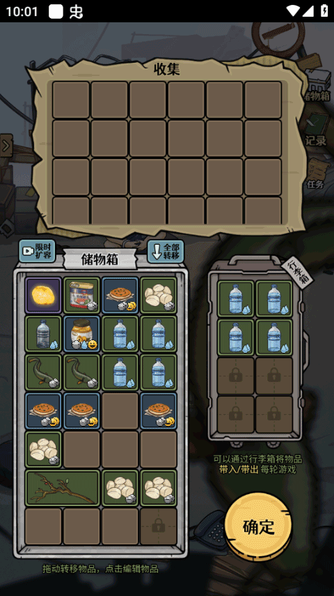 11、翠花完成拾荒后,点击她所拾得的物资,把物资全部转移至储物箱。要是储物箱容量不足,可点击限时扩容,此扩容免费,无需观看广告。当小伙伴们感到饥饿时,要给他们适量的食物,不必担忧食物不够,因为随着拾荒技术不断升级,大家不会面临饿死的情况。
