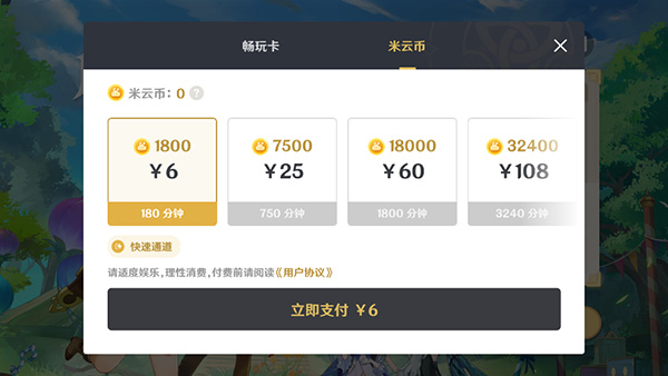 2、持有米云币的玩家,若没有生效中畅玩卡或免费时长,将默认进入快速通道进行排队,本次游戏将使用米云币支付。