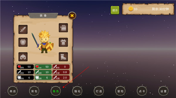1、开启《地下城与商人》最新版本,点击进入后,选择【角色】选项,便能知晓已有角色的各类属性及装备情况。