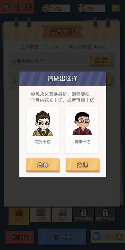 游戏伊始,便以漫画形式呈现你与富二代的交换过程。随后,你可任选一种方式实现彻底交换:要么在一个月内花光10亿,要么在一个月内赚到10亿。