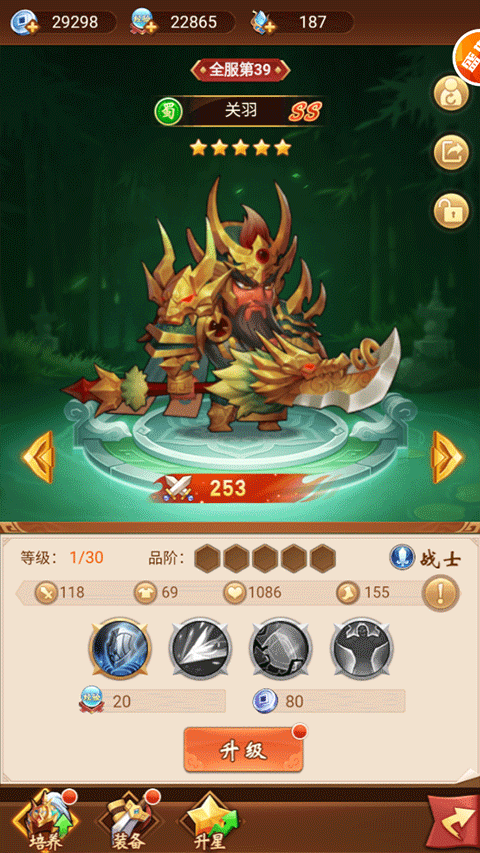 3、武将选择部分。鉴于资源有限,大家通常优先培养一名武将。测试服首个限时武将为曹操,因此大佬们都对曹操进行极限培养。限时活动时尽量多抽取武将本体,否则难以升至11星以上。高级令和拜将令要积攒到活动时一同抽取,以获取奖励。武将要挑选好再升星,切勿随意升星。紫色武将留着合成五星,不要随意分解,非本阵营所需的再分解获取石头。零氪玩家可以考虑对关羽进行极限培养。