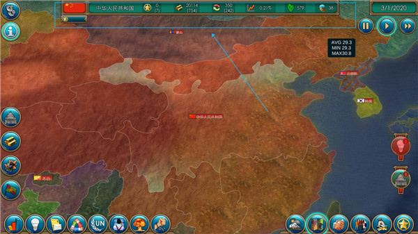 在游戏界面的上方,展示着国家的关键信息,同时各类国际新闻以及国际事件也会在此处实时更新。