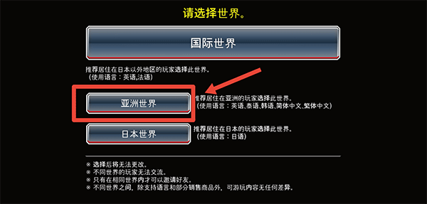 1、当进入游戏,玩家首先要选择世界,此时选择亚洲世界即可,亚洲世界支持简体中文与繁体中文。