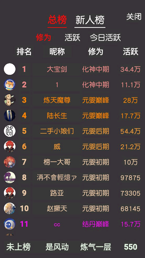 活跃获取方式:用户每日首次登录、突破修为、成功炼丹、成功修炼功法、成功升级法宝、成功升级灵宠、通关副本、重置副本、扫荡副本、完成支付、获取天灵根、使用兑换码、使用丹药、签到、催熟灵草等行为,均可增加活跃值。