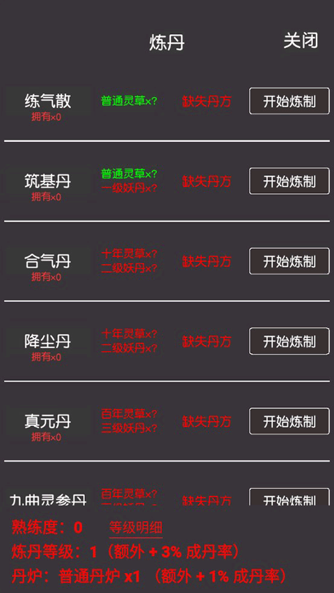 炼丹:可通过增加熟练度和购买丹炉提高成丹率,丹炉可叠加。