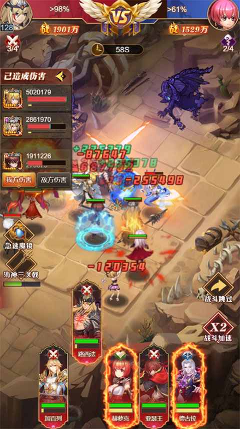 神器能够直接投身战斗,一旦神器充能完成,便会召唤神器发动一轮攻击。各类神器所产生的攻击效果各有不同,像灼烧、眩晕之类的效果都有可能出现。而充能的具体进度,可在战斗界面右下角进行查看。