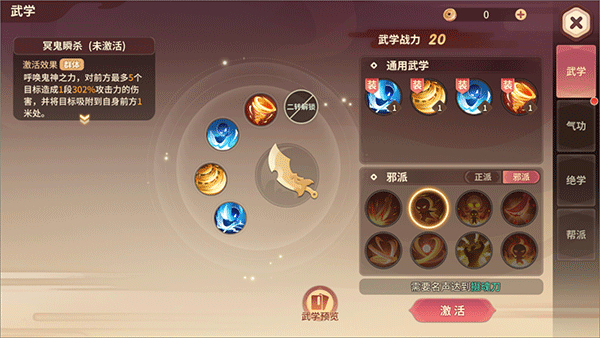 闯荡江湖,自然得有门派基本功作为依靠。“武学”乃是每位职业侠士进入游戏后获取的人物基础技能,提升武学技能,能在战斗中具备更强的杀伤力。而且角色完成转职后,可学习更高级的技能,正派与邪派分别有着不同的技能分支可供学习。随着新的转职武功学成,玩家角色的职业定位也会相应改变。侠士们能够自由组合技能,在战斗中也就更加简便灵活。