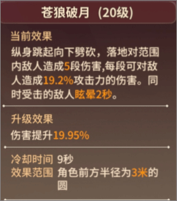 苍狼破月:此为范围型伤害技能,释放后能对角色前方半径3米范围内的敌人发动多段伤害攻击。遭受攻击的敌人会被眩晕2秒,与“一阳贯日”近身的特性相配合,可快速控制对手并造成伤害。