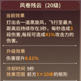 风卷残云:与其他技能一样属于多段伤害技能,风卷残云的攻击范围更为广泛。对于近身职业而言,在团战中能够率先使用此技能,对较大范围内的敌人造成伤害,从而吸引仇恨。不过需要留意的是,该技能仅能攻击角色前方的敌人。