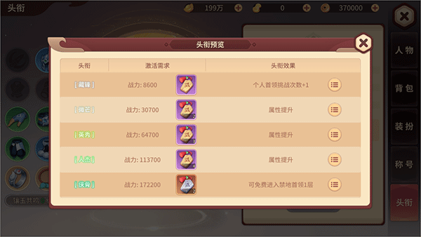 在知晓了怎样获取头衔之后,我们接着来瞧瞧头衔都有哪些作用。随着等级的升高,头衔所展示的文字与颜色都会有所不同,一眼看去,那些拥有高等级头衔的侠士,无疑就是“厉害”的代表!而且,提升头衔,不但能让侠士们获得可观的属性加成,还能享有一些额外福利,像个人首领挑战次数增加1次、能够免费进入禁地首领1层之类的。