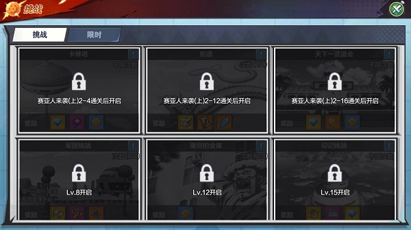 1. 限时挑战包含以下内容:宇宙第一武道会、魔人复苏、界王的修炼、沙鲁游戏、格斗大赛、强敌入侵、银河攻略以及军团争霸。