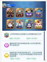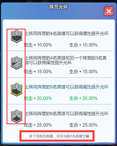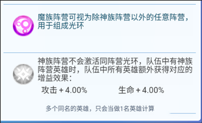 上阵同阵营的4名英雄和另一个阵营的3名英雄可以获得属性提升光环