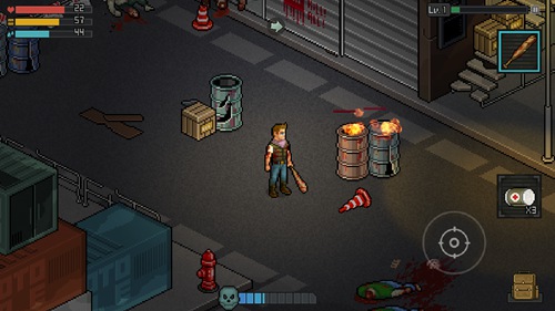 1、进入游戏后,我们会在地上捡到一根棒球棍,这就是我们的初始武器了,直接点击屏幕左下角的攻击按钮就能自动攻击自己身边的僵尸。