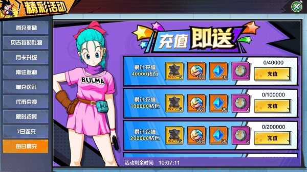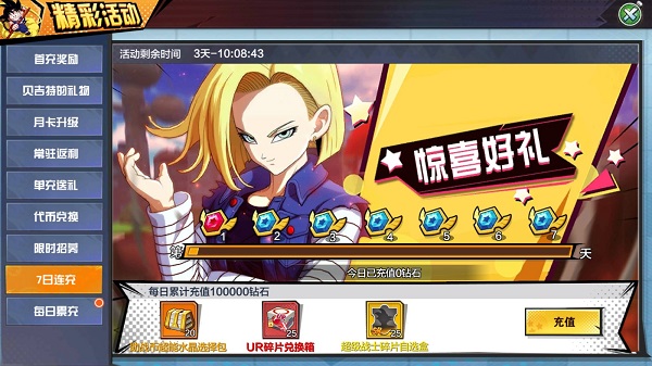 连续7天进行累积充值,若单日累计充值达到100000钻石,就能获取UR碎片、超级战士碎片自选盒以及超能水晶选择包。