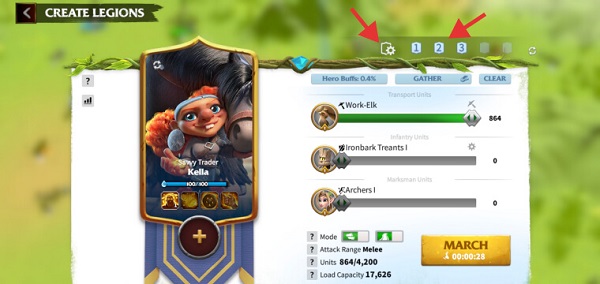 要创建军团预设,请点击地图上的任何敌人或资源点,然后点击“创建军团”。通过选择你想要的部队类型和指挥官来创建你的军团,然后点击页面顶部的小齿轮图标。