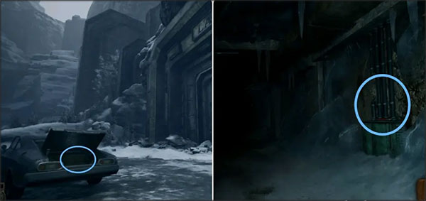 5、在道具栏中将丙烷罐与喷嘴进行组合,之后回到设施入口处(也就是电箱所在位置),使用组合好的道具融化左边铁皮柜上的冰块,随后取走里面的润滑脂以及管子2 。
