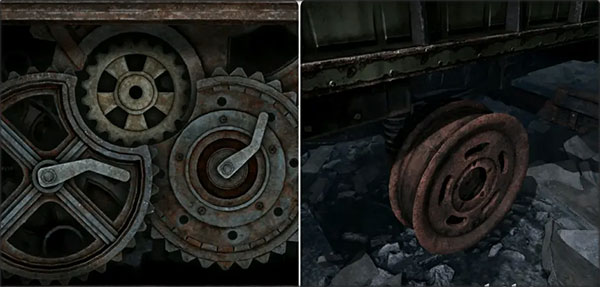 8、前往火车站台,在轨道的铁皮盖上涂抹润滑脂,接着滑动盖子,让下方的齿轮组显露出来。在此处,需转动左右两边的齿轮,以此操控上方的大齿轮,直至三个缺口连接成一体。完成这些操作后,取走下方的小齿轮,随后前往车厢处。