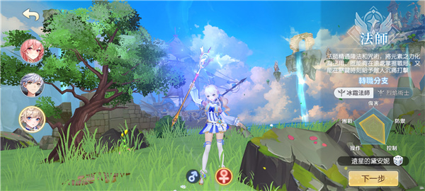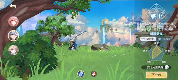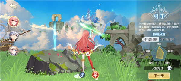 3、进入游戏后,依次进行选择角色(角色分为“弓手”、“战士”、“法师”)、输入角色名称、选择性别等操作,完成后点击“下一步”。