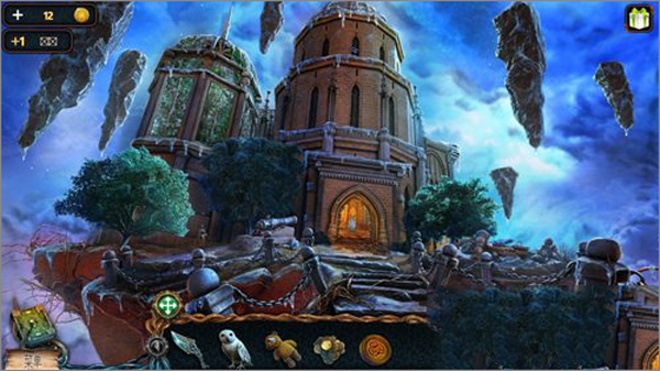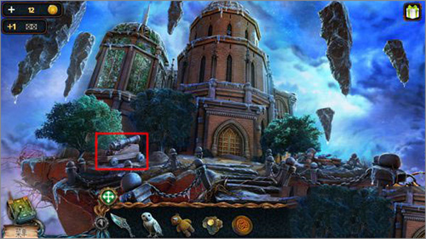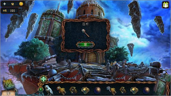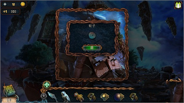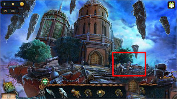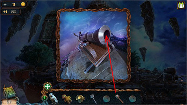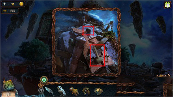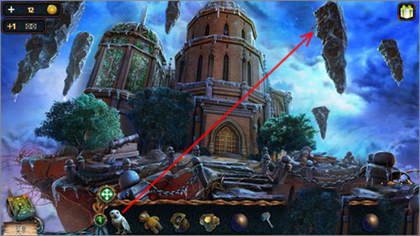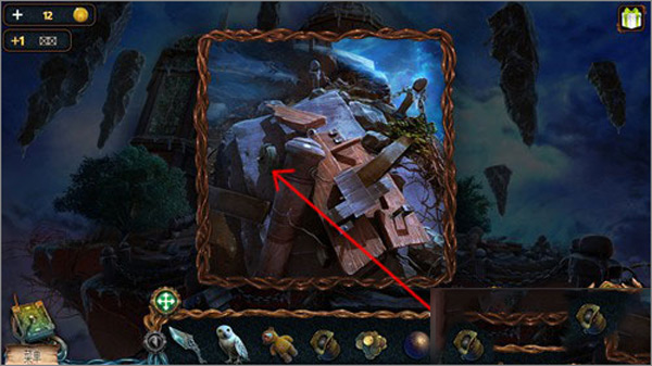 5、首先点击猫头鹰,接着点击右上角悬浮着的石头,如此便能让猫头鹰飞上去把推杆取下来。