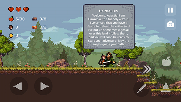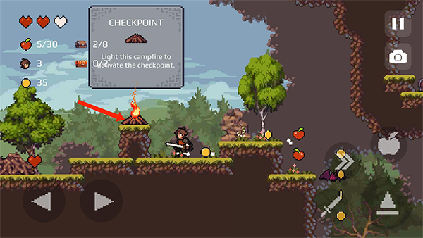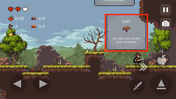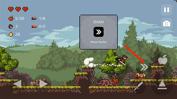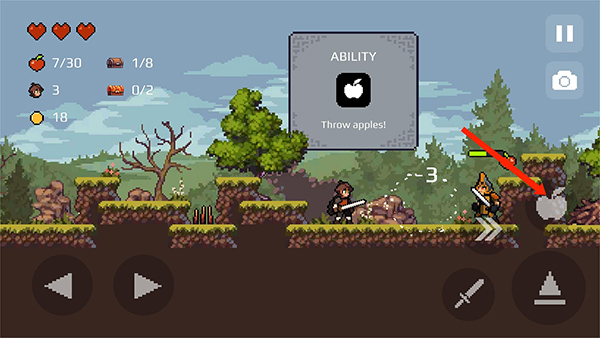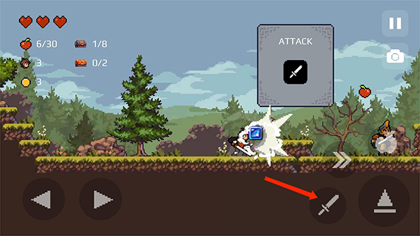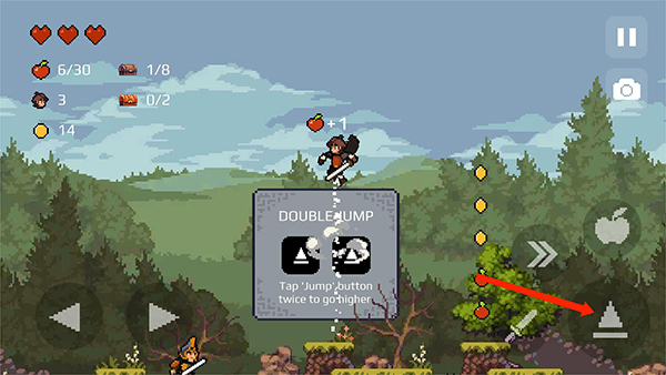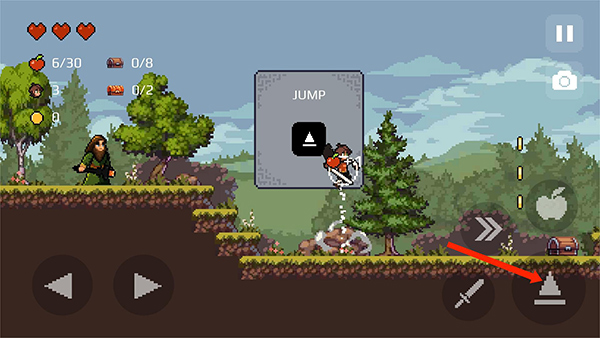 3、与游戏NPC完成对话后,继续向前行进。此时,右下角的【三角形】图标就是跳跃键,试着通过点击该跳跃键进行跳跃,以接取图中的苹果。
