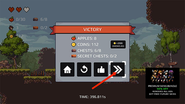 11、通关后可获得苹果、金币、宝箱等奖励,选择【双箭头号】图标可进行下一关,