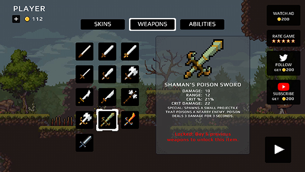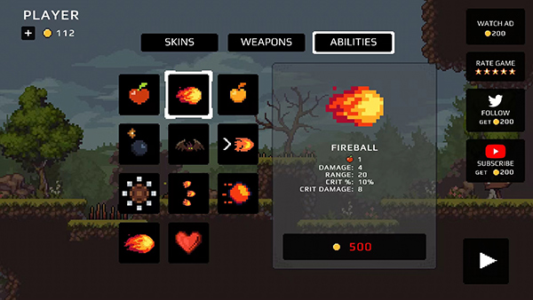 12、在游戏里,存在着诸如SKINS人物皮肤、WEAPONS武器、ABILTIES技能等各式各样的资源,玩家能够凭借持续闯关来解锁并使用。以上便是苹果骑士地下城的玩法。