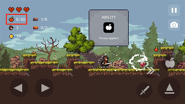 6、在左上角的区域,是角色的属性栏,其中涵盖了生命值、苹果数、宝箱数以及金币数等信息。若点击右边的【苹果】图标,就能利用苹果对敌人发起攻击,不过在这个过程中,苹果数会相应减少,因此需要合理运用苹果进行攻击。