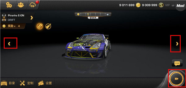 1在开始比赛之前,你可以先点击左右栏来切换赛车。当选中自己心仪的赛车后,再点击右下角的标志,即可开始比赛。