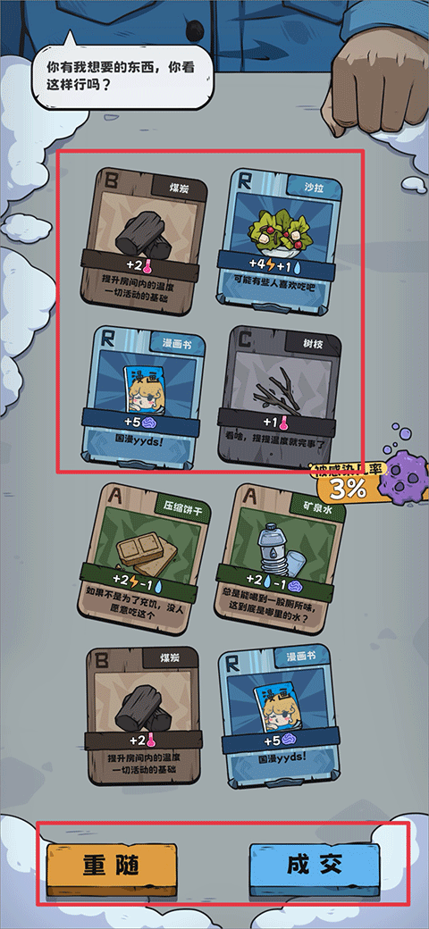 7、接着,对方会依据你出示的卡牌,给出他自己的卡牌。要是你对对方给出的卡牌感到满意,就能够点击“成交”;要是不满意,就点击“重随”。